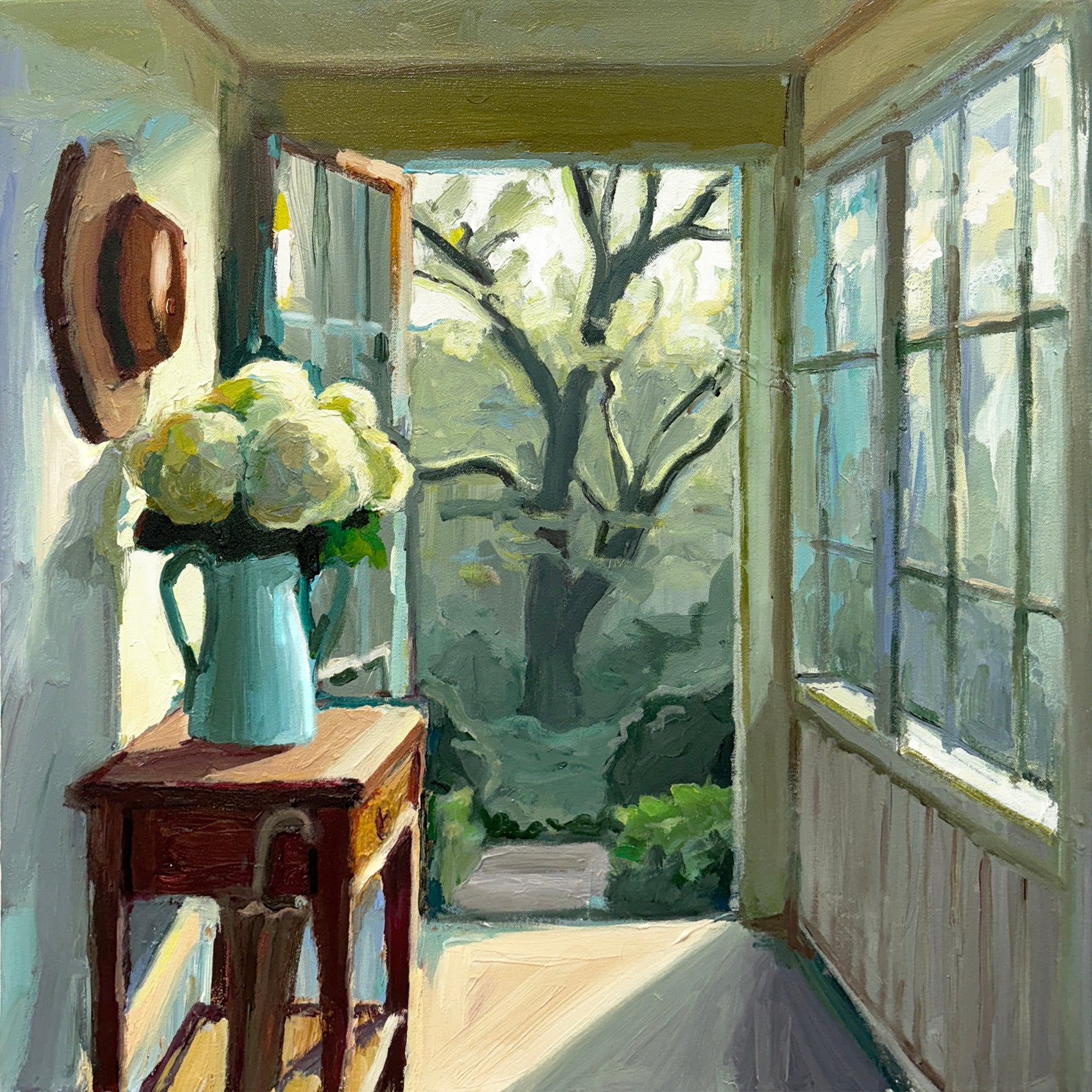 I love how hydrangeas can soften the edge between inside and out — as if the garden has one foot in the hallway.